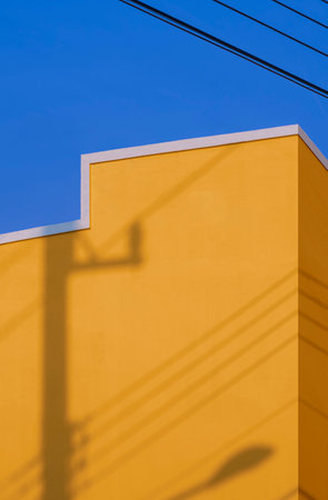 Shadow of electric pole on surface of yellow building wall with power lines against blue sky in vertical frame