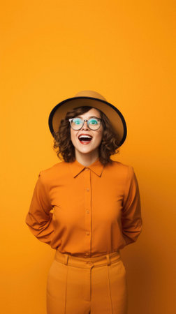 Portrait of a beautiful woman wearing sunglasses and a hat on orange background.