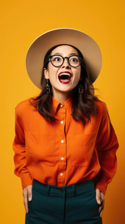 beautiful asian woman in yellow dress and hat against orange wall
