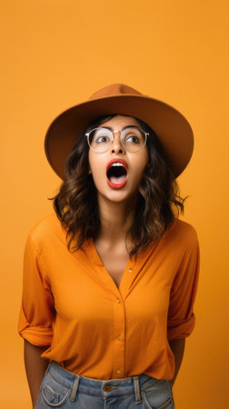 Portrait of young woman in yellow shirt with open mouth.
