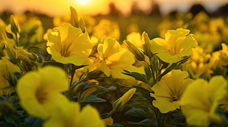 Yellow flowers stand tall in a spring field as the warm sky creates a lovely backdrop for the scene.