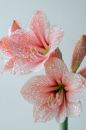 Delicate pink flowers stand in a gentle arrangement, their petals adorned with droplets of moisture. Soft light highlights their unique shapes in a calm, serene environment, capturing the essence of a tranquil morning.