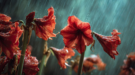 Amaryllis in a storm, heavy rain pouring down, strong winds twisting their leaves