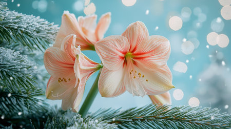 Bright pink amaryllis flowers bloom gracefully against a backdrop of frosted pine needles, sparkling with winter's magic. Soft, ethereal light enhances the serene beauty of this tranquil scene.