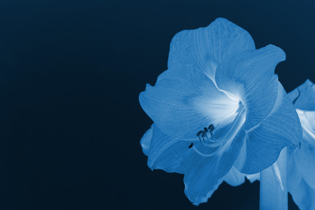 close-up of hippeastrum, one blooming flower, red with white stripes, blue background,
