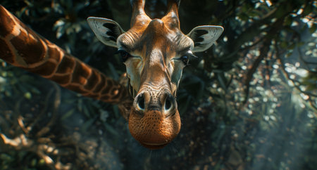 Majestic giraffe observing from lush dark tropical jungle foliage in the wild, exotic wildlife scene