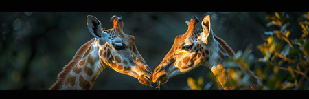 Two giraffes facing each other with a blurred green background, warm lighting, and space for text.