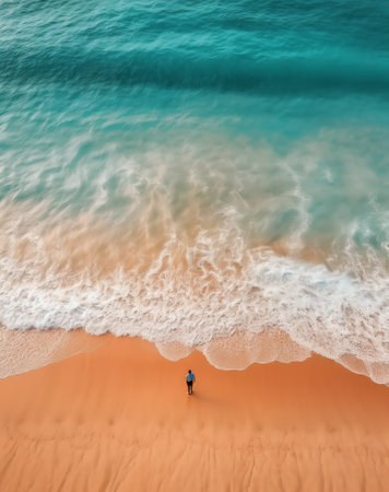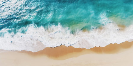 This image captures an aerial perspective of dynamic ocean waves crashing onto a pristine sandy beach, showcasing clear, rhythmic patterns and vivid colors that evoke a sense of tranquility and natural beauty encapsulated within the seascape.