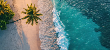 Aerial view of a tropical beach with palm trees and turquoise ocean. Summer travel and vacation concept. Landscape design for banner, poster