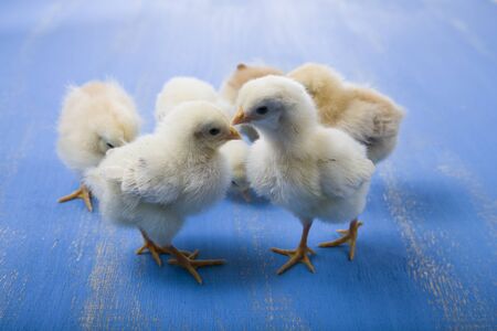Fluffy little yellow chickens on a blue wooden background. Card for Easter.