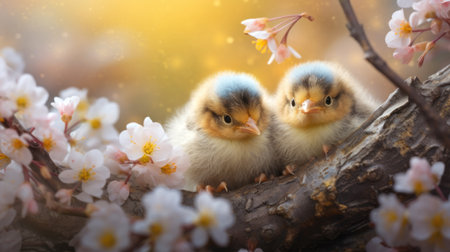 Easter chickens. Couple of little chicks walking among spring flowers and Easter eggs.