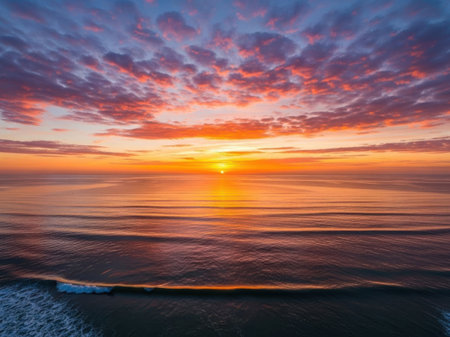 Stunning sunset over ocean creates vibrant display of colors, with sun casting warm glow on water. serene atmosphere evokes feelings of peace and tranquility