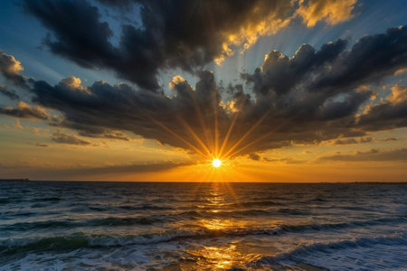 A breathtaking view of a sunset over a calm ocean, featuring vibrant clouds illuminated by sunbeams, creating a serene and tranquil atmosphere for nature lovers.