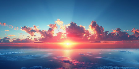 Breathtaking view of a sunrise over the horizon, illuminating the sky with vibrant colors and rays of light, creating a serene and peaceful atmosphere for reflection.