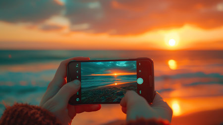 Two hands holding a smartphone capturing the breathtaking scene of a sunset on the ocean, with waves gently lapping the shore.