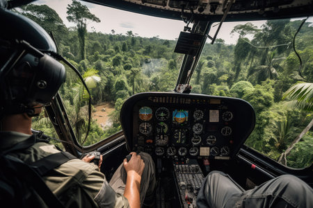 close-up of helicopter cockpit, with pilot at the controls and jungle visible beyond, created with generative ai