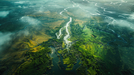 Generative AI : Earth in satellite photo aerial top view of river delta in tropical forest Nature pattern seen from space Satellite picture as abstract green texture background Ele
