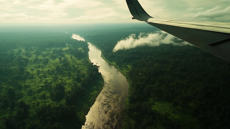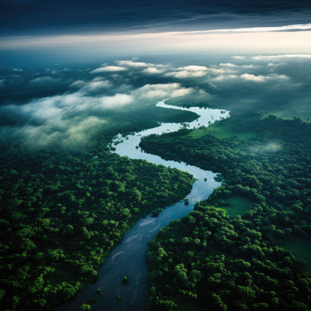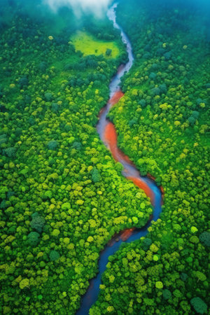 aerial shot of rainforest in river by the jungle, showcasing the moody tonalism style of art found in the congo. this national geographic photo captures a realistic and detailed rendering of the scene, with soft edges and atmospheric effects adding to its allure. ai generated