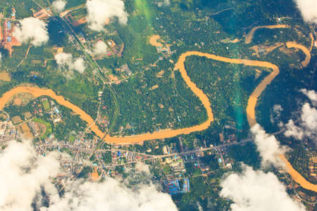 A long river in Gunung Mulu National Park Malayasia seen from the plane. Sky is covered with clouds, the river is winding with many bends, brownish in color. The banks are surrounded by a thick forest