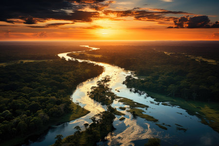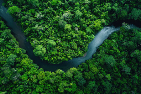 A breathtaking aerial view of a winding river cutting through a vibrant rainforest, showcasing the rich biodiversity and stunning natural beauty of a tropical wilderness habitat.