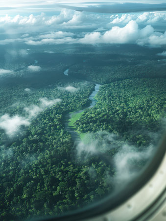 Aerial view of Amazon rainforest landscape from plane window. Dense green foliage and winding river stretch as far as the eye can see, set against a serene blue sky dotted with white clouds.