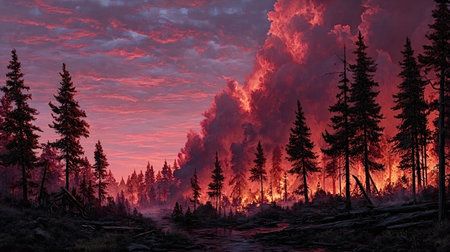 Forest wildfire burning through dense coniferous trees, generating massive smoke clouds and a fiery red sky, highlighting the destructive impact of climate change and environmental disaster