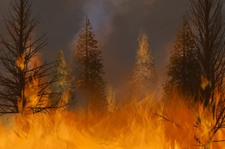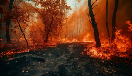 A fiery forest scene consumed by flames, smoke, and destruction. A powerful image depicting the danger of wildfires.