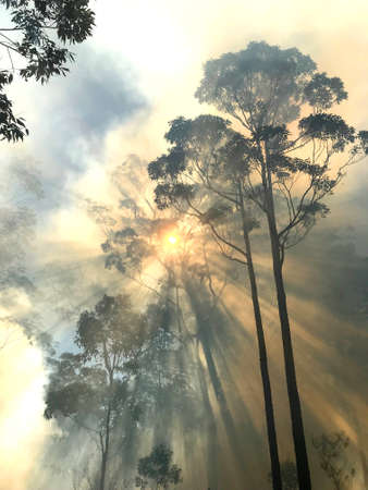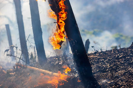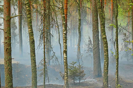 Forest fire. Burned trees after wildfire, pollution and a lot of smoke.