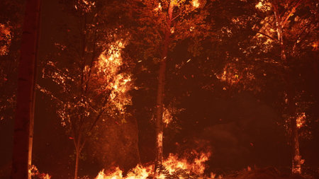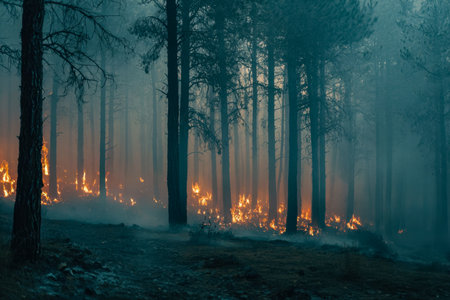 Flames engulfing trees and undergrowth in a forest fire burning at night, creating a dramatic and devastating scene of environmental damage