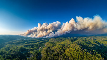 A sprawling woodland scene interrupted by a widespread blaze, where thick plumes ascend against a bright, cloudless sky, emphasizing nature's vulnerability.