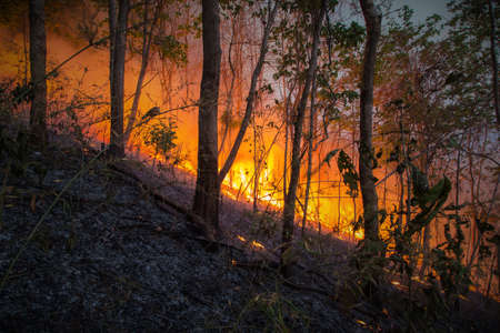 Forest fire, Wildfire burning tree in red and orange color at night in the forest on mountain, North Thailand, Soft focus.