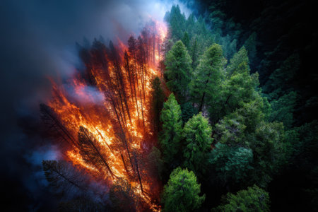 A fierce wildfire consumes trees while smoke billows into the sky, showing destruction and nature's contrast.