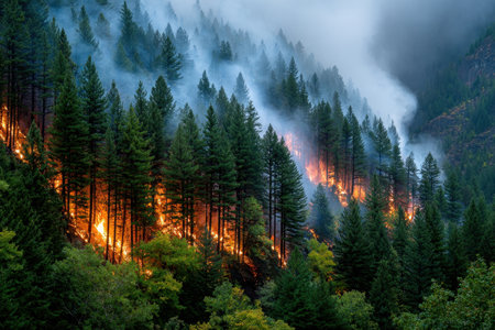 A fierce blaze engulfs rugged mountain terrain, casting an ominous glow as billowing smoke spirals into the evening sky amid smoldering evergreens.