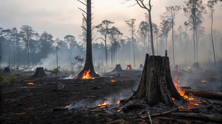 A striking image captures the aftermath of a wildfire, showcasing burned trees amidst smoke and ash, revealing the impact on the landscape and ecosystem.