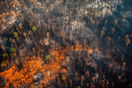 aerial view of regrowth patterns across burnt forest, created with generative ai