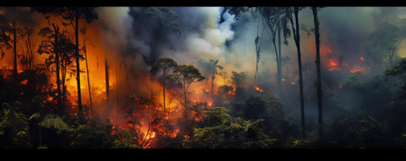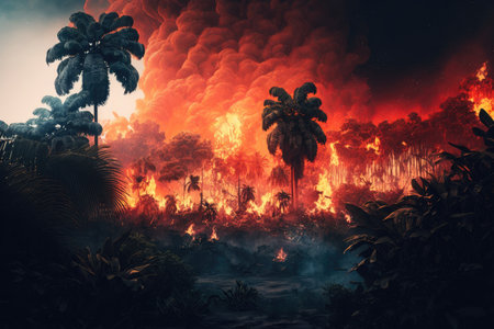 dense jungle burning on the horizon with flames and smoke, created with generative ai