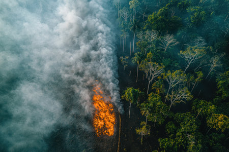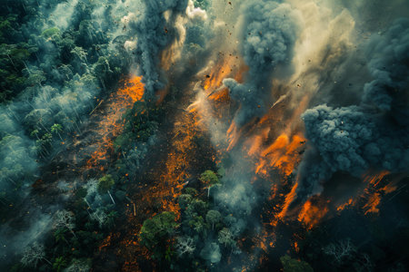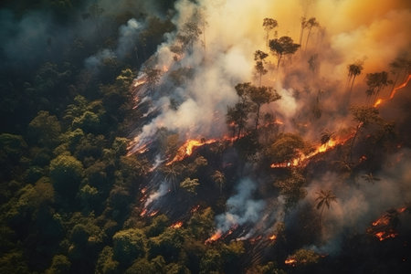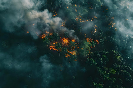 An Aerial view of rainforest fire with smoke and trees, highlighting deforestation