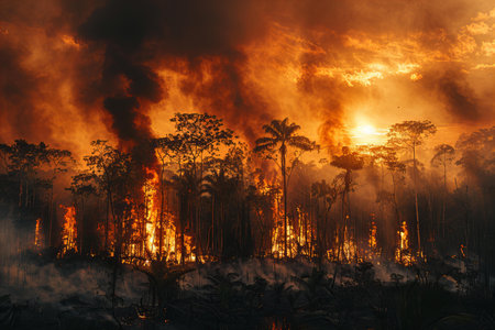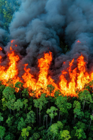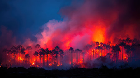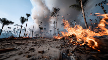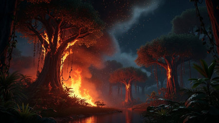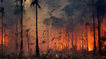 A dramatic scene depicting a wildfire ravaging a tropical forest, engulfing trees in flames and producing thick smoke, symbolizing environmental crisis.