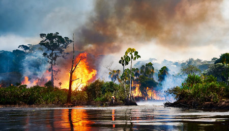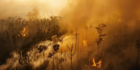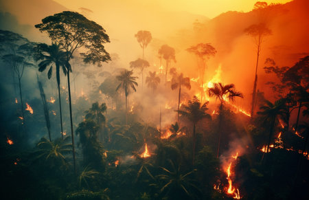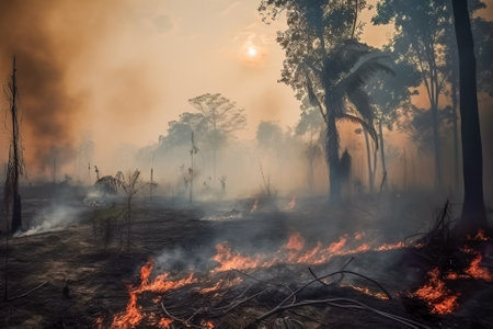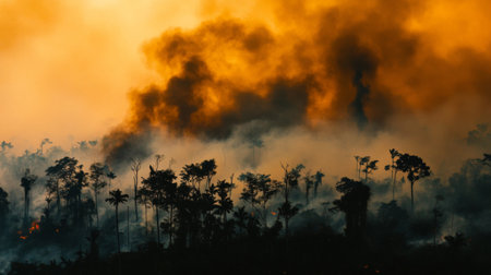 A burning rainforest in the amazon, brazil, with smoke and flames rising from the trees, depicting the concept of global warming,