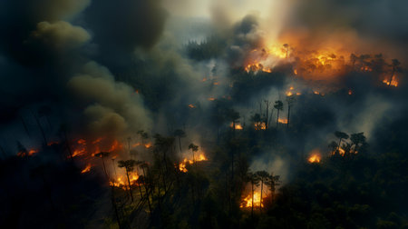 Wildfire Inferno: A raging wildfire engulfs forests, releasing clouds of smoke and ash into the sky