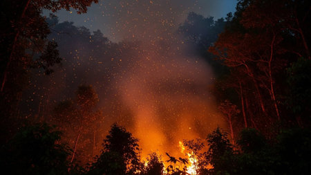 Burning forest floor with glowing embers and sparks creating dramatic and intense natural scene at dusk