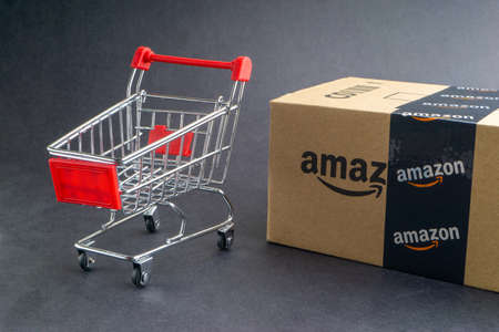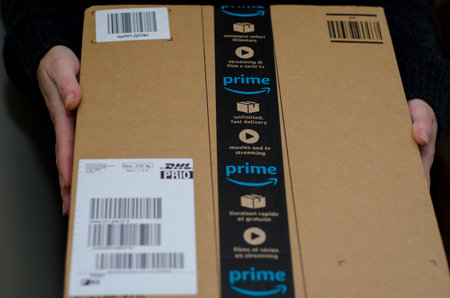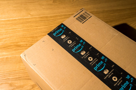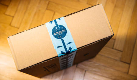 WARSAW, POLAND - AUGUST 23, 2019: Amazon Prime online store order delivered package in Europe. Amazon is considered one of the Big Four global tech companies.