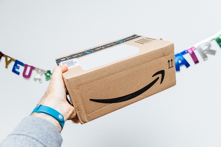 Paris, France - Jun 11, 2018: Freshly delivered Amazon Prime cardboard box featuring big smile on the textile couch background