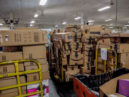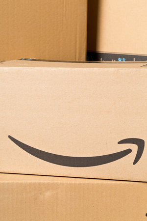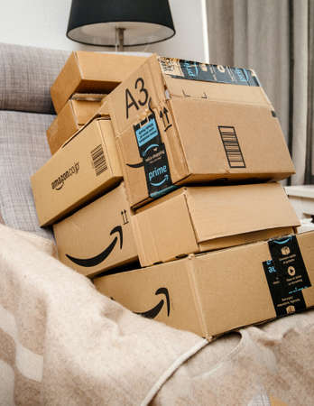 Tallinn, Estonia - March, 2022 : Stack of Amazon Prime parcels over white background. Amazon for faster delivery of orders.