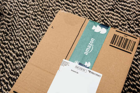 PARIS, FRANCE - JAN 28, 2016: Amazon logotype printed on cardboard box side seen from above on a wooden parwuet floor. Amazon is an American electronic e-commerce company distribution worlwide e-commerce goods