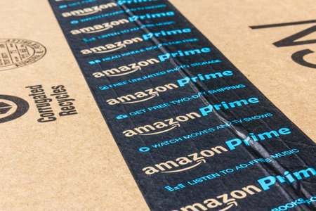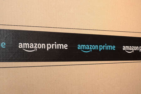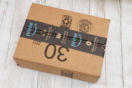Detroit, USA - OCT 9, 2019: Amazon Prime shipping box with branded tape on it. Amazon is an American electronic commerce and cloud computing company.