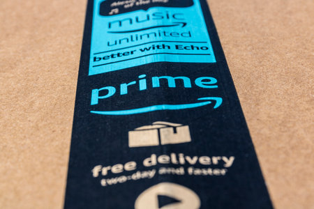 DRESDEN, GERMANY - APRIL 3, 2019 : Close up of Amazon Prime logo on tape of delivered parcel. Prime is a service offered by online retailer Amazon for faster delivery of orders. Selective focus.
