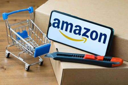 Kazan, Russia - May 14, 2021: Amazon is an American multinational technology company, which focuses on e-commerce, cloud computing, digital streaming, and artificial intelligence.