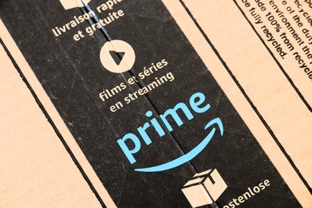 MONTREAL, CANADA - JANUARY 1, 2019: Amazon Prime holiday package with logo. Amazon, is an american technology company focusing on e commerce and cloud computing company,based in Seattle, WA