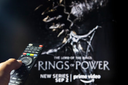 Belgrade, Serbia - September 12, 2022: The Lord of the Rings: The Rings of Power TV series on TV with remote control in hand. Focus on the remote control. Story takes place thousands of years before the events of J.R.R. Tolkien's 'The Hobbit' and 'The Lor